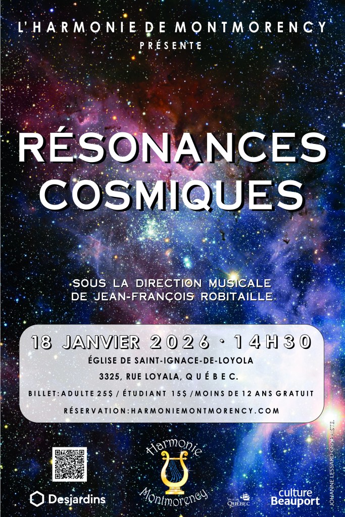 Qui n’a jamais regardé au ciel sans se poser de questions sur l’univers, ses secrets, ses mystères, sa création? Résonances Cosmiques invite le public à un voyage musical à travers cet univers. Portée par l’Harmonie de Montmorency et son directeur musical, Jean-François Robitaille, cette soirée promet une expérience sonore unique, où chaque note évoque la beauté, l’immensité et le mystère du cosmos. Au programme, des œuvres inspirées par les étoiles, les planètes et l’infinies par les compositeurs Robert Sheldon, Brain Balmages, Julie Giroux, Jan Van Der Roost, Robert Buckley, Micheal Sweeney, Gustav Holst, Ola Gjielo, Richard Strauss et Alexander Courage. Ce concert est une ode à la curiosité et à la contemplation, un moment suspendu entre ciel et terre, où la musique devient la résonance des astres et de l’infini.